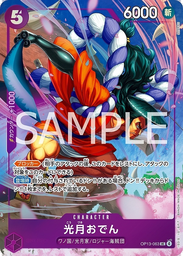 - ≪テキスト≫【ブロッカー】(相手のアタックの後、このカードをレストにし、アタックの対象をこのカードにできる)【登場時】自分の付与されているドン?がある場合、ドン?デッキからドン?1枚までを、レストで追加する。