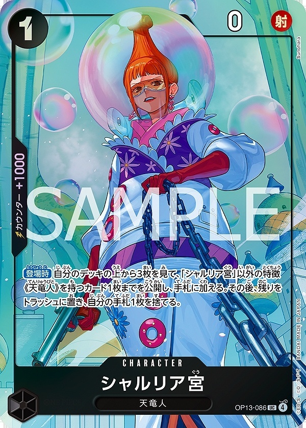 - ≪テキスト≫【登場時】自分のデッキの上から3枚を見て、「シャルリア宮」以外の特徴《天竜人》を持つカード1枚までを公開し、手札に加える。その後、残りをトラッシュに置き、自分の手札1枚を捨てる。