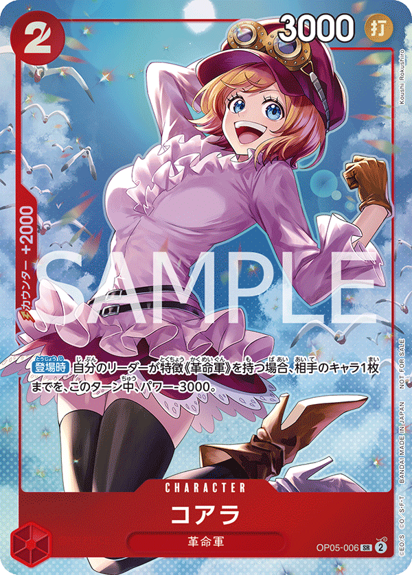 - ≪テキスト≫【登場時】自分のリーダーが特徴《革命軍》を持つ場合、相手のキャラ1枚までを、このターン中、パワー-3000。